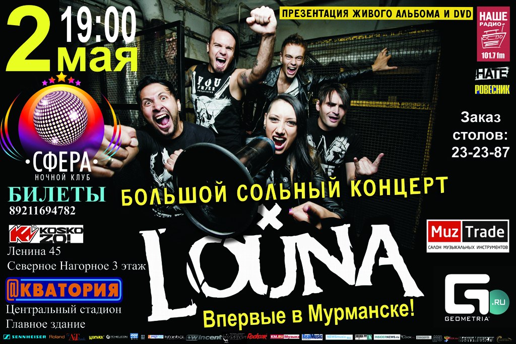 Итак друзья наконец-то это свершилось! Они едут к нам, в наш Город-Герой. Группа LOUNA из Москвы взорвет клуб СФЕРА совсем скоро! 2 мая в 19:00 начало феерического шоу, море взрывного драйва и энергия настоящего РОКА зарядит вас в этот вечер! Настоящим ценителям Рока уже давно известен этот молодой и успешный коллектив!Добро пожаловать на праздник живой музыки!