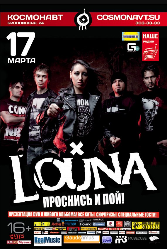 Итак, 17 марта в клубе «Космонавт» все посетители большого сольного концерта смогут одними из первых приобрести и оценить новый концертный DVD и альбом LOUNA «Проснись и пой!» (будет открыта специальная точка продаж дисков и атрибутики группы), а также посмотреть полноформатное рок-шоу группы, в котором по традиции не обойдется без сюрпризов: в выступлении примут участие специальные гости из дружественных коллективов, которые поднимутся на сцену, чтобы сыграть или спеть вместе с LOUNA. Как всегда будет жарко. Не пропустите!
